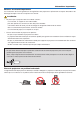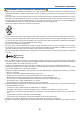 Informations Importantes Consignes de sécurité Précautions Veuillez lire ce manuel avec attention avant d’utiliser votre projecteur NEC et conserver le manuel à portée de main pour toute consultation ultérieure. ATTENTION Pour couper complètement l’alimentation, retirez la prise du secteur. La prise du secteur doit être accessible et installée le plus près possible de l’appareil. ATTENTION POUR ÉVITER TOUT CHOC ÉLECTRIQUE, N’OUVREZ PAS LE BOÎTIER. A L’INTÉRIEUR SE TROUVENT DES COMPOSANTS À HAUTE TENSION.