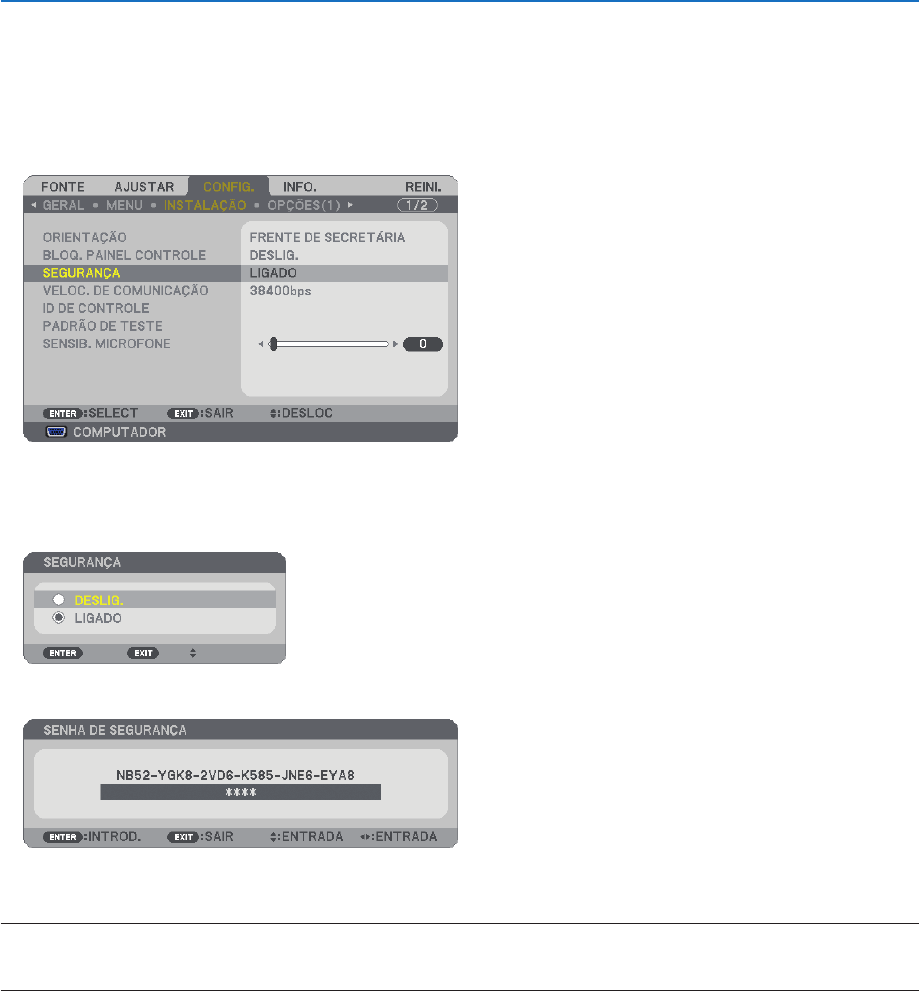 2.Selecione[CONFIG.]→[INSTALAÇÃO]→[SEGURANÇA]epressioneobotãoENTER.