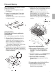 Filtres et entretien Mise au rebut des nattes filtrantes usagées: 1. Appuyez sur les boutons de verrouillage situés à gauche et à droite de la grille. 2. Retirez la grille du filtre. 3. Retirez la grille en fil puis retirez la natte filtrante saturée. 4. Nettoyez la grille du filtre puis installez une nouvelle natte filtrante. 5. Bridez la natte filtrante au moyen de la grille en fil. 6. Remontez la grille du filtre. Les boutons de verrouillage doivent encranter des deux côtés.
