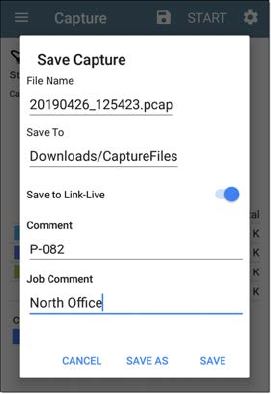 Captures are saved as .pcap files. Touch any of