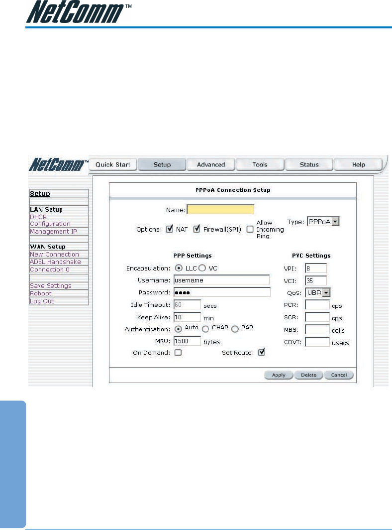 To setup PPPoA, select WAN Setup >New Connection. From Type: select PPPoA. This will reveal