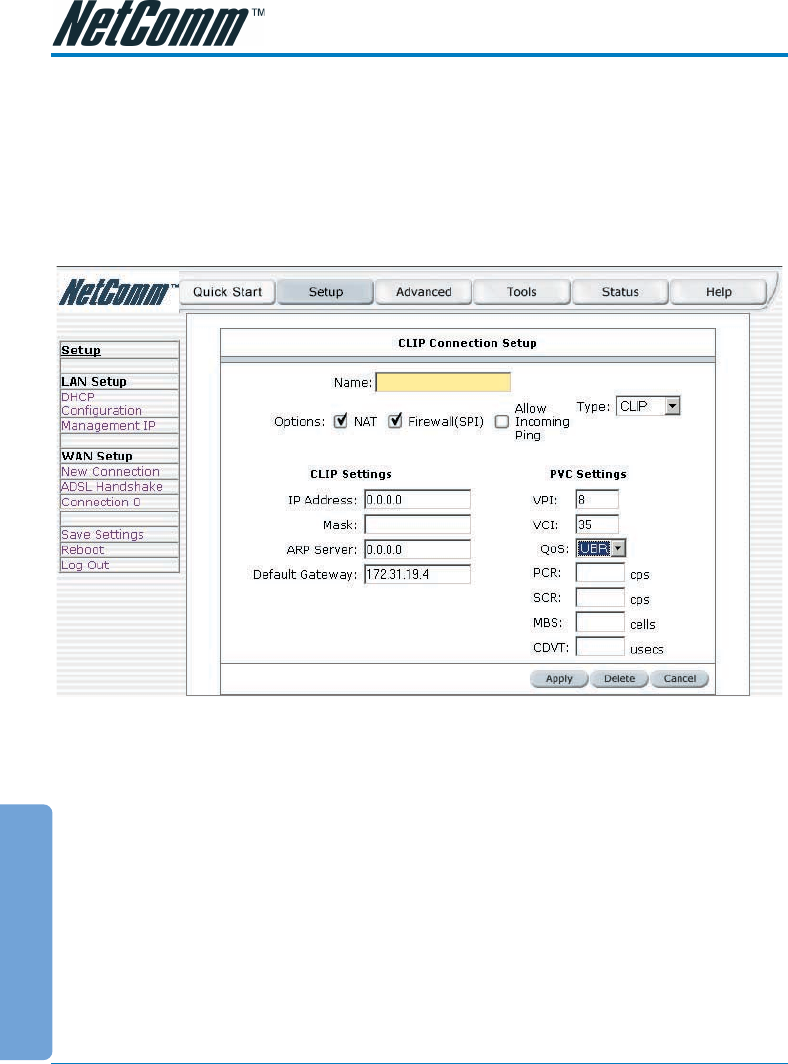To setup a CLIP connection, select WAN Setup >New Connection. From Type: select CLIP. This will