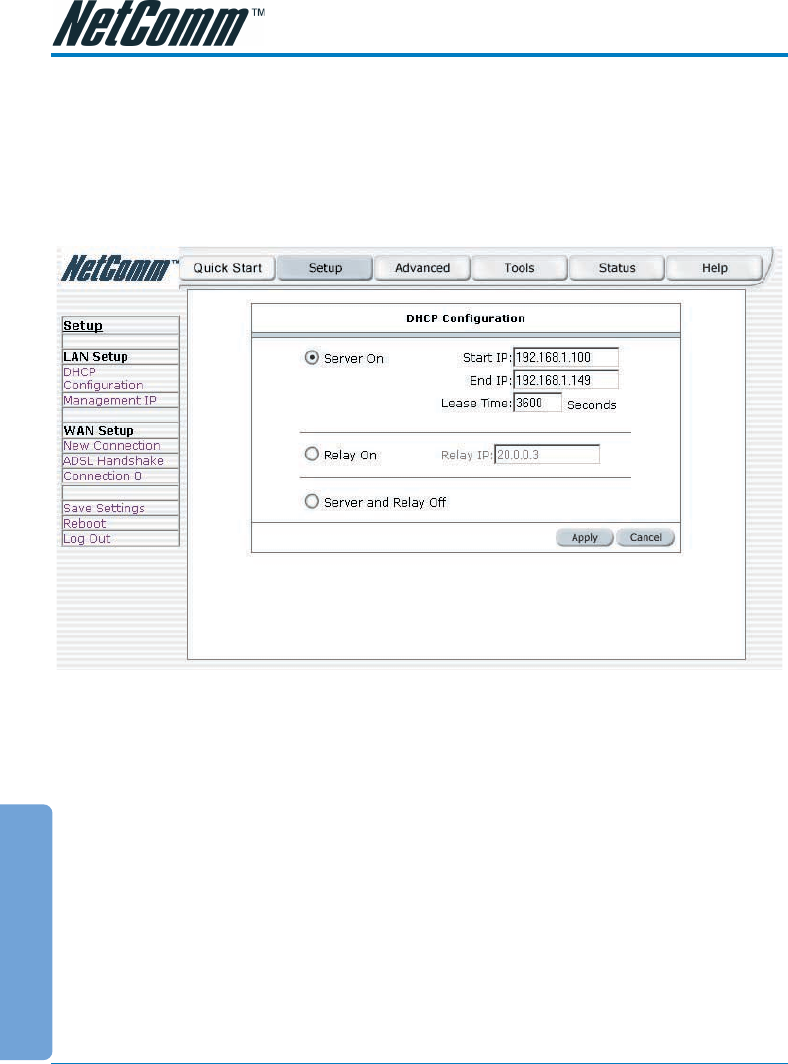 To access the DHCP Configuration Screen, click Setup>LAN Setup>DHCP Configuration.