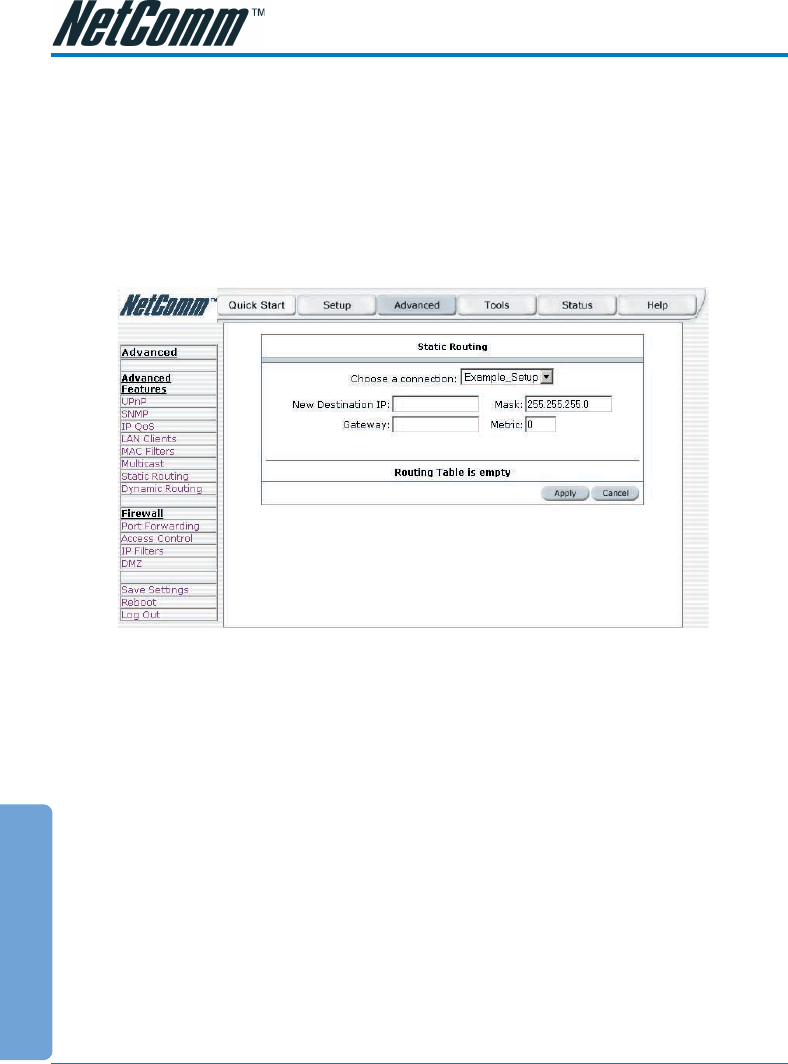 To access the Static Routing controls, click on Advanced>Advanced Features> Static Routing.