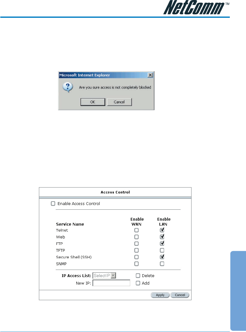 The default configuration enables Telnet, Web, FTP and SSH access FROM the LAN TO the WAN.