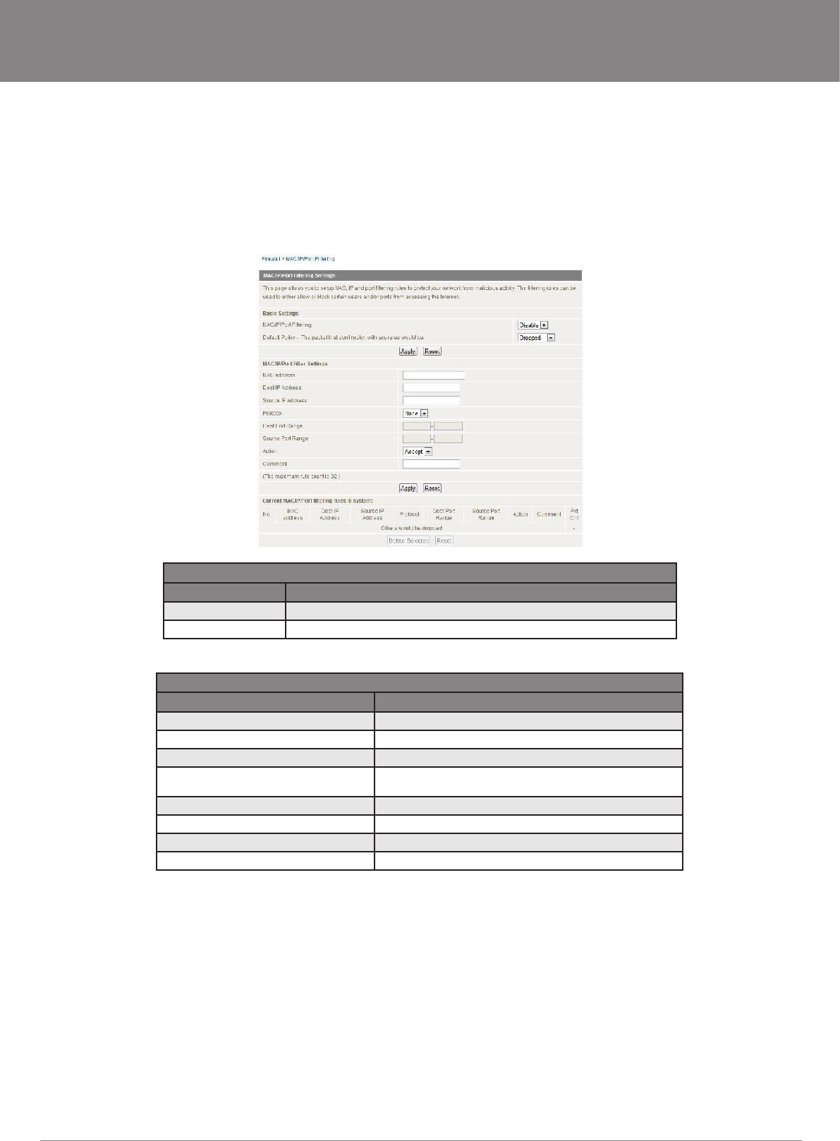 This page allows you to setup MAC, IP and port ltering rules to protect your network from malicious activity. The ltering rules can be used