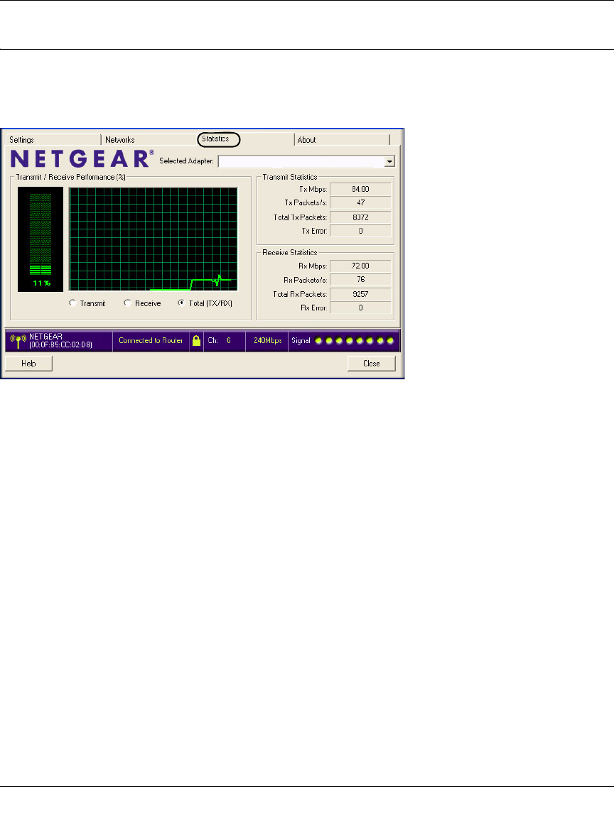• Transmit/Receive Performance (%): A real time graph identifying the total, receive, and