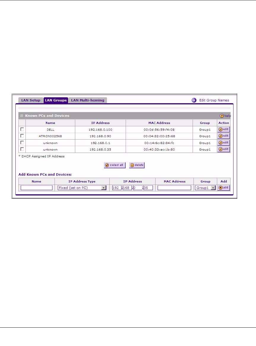 The Known PCs and Devices table lists the entries in the LAN Groups Database. For each