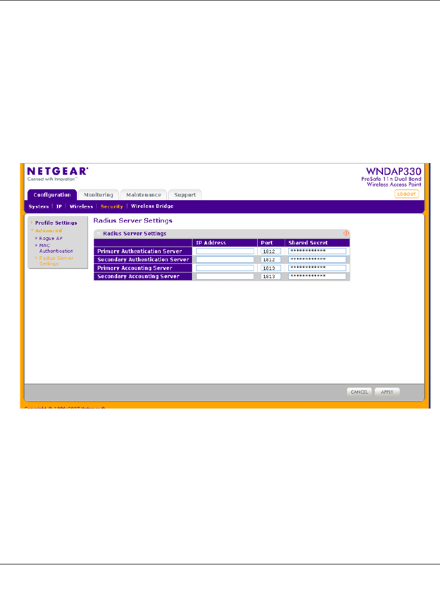 – IP Address. The IP address of the RADIUS Server. The default is 0.0.0.0.
