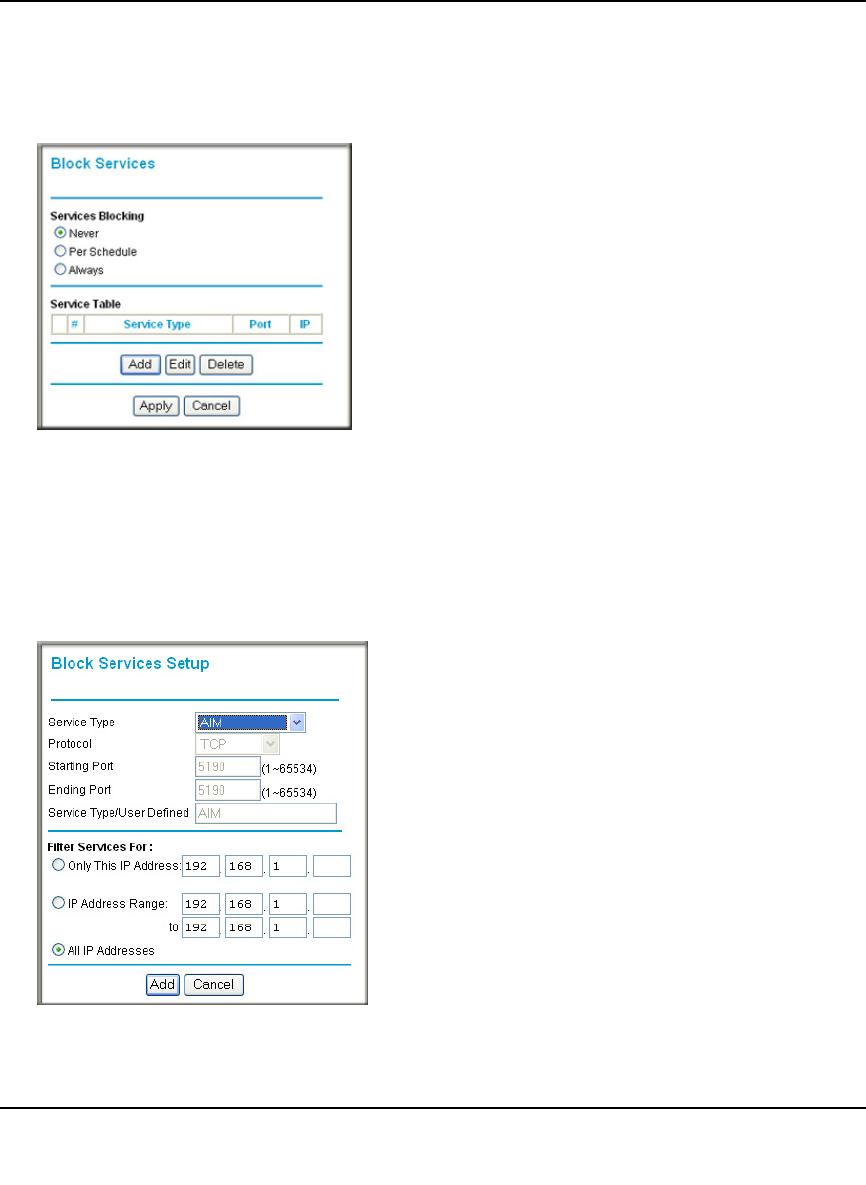 3. Specify a service for blocking by clicking Add. The Block Services Setup screen displays.