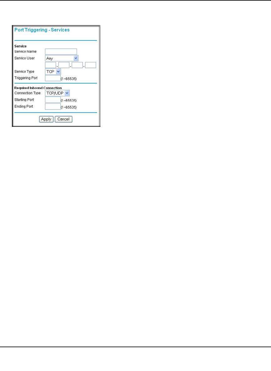11. Click Apply. The service appears in the Port Triggering Portmap table.