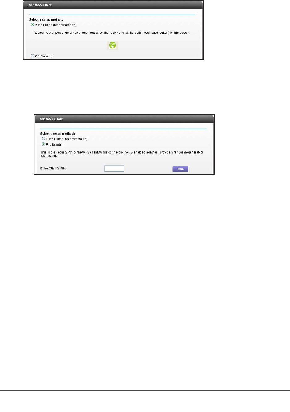 • Push button. Either click the WPS button on this screen, or press the WPS button on