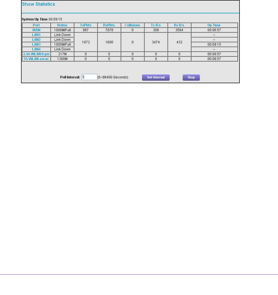 The statistics for the WAN (Internet) and LAN (Ethernet) ports. For each port, the