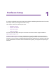 1. 1 Hardware Setup If you have not already set up your new router using the installation guide that comes in the box, this chapter walks you through the hardware setup. This chapter contains the following sections: • Hardware Features • Position Your Router • Cable Your Router • Verify the Cabling For more information about the topics covered in this manual, visit the support website at http://support.netgear.com.