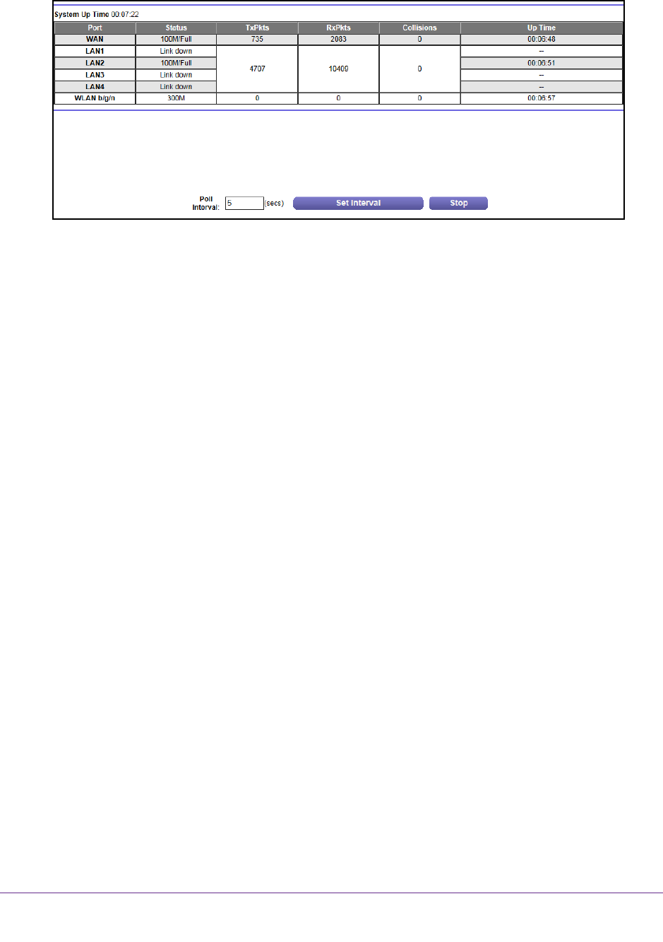 The statistics for the WAN (Internet) and LAN (Ethernet) ports. For each port,