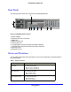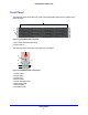 NETGEAR ReadyDATA 5200 Front Panel The following figure shows the front panel of the ReadyDATA 5200 with the optional front bezel removed. 1 2 Figure 1. ReadyDATA 5200 front panel 1. Drive bays with disk status LEDs 2. Control panel The following figure shows the control panel in more detail. 1 2 3 6 4 5 7 8 Figure 2. ReadyDATA 5200 control panel 1. Power button 2. Reset button 3. Power LED 4. Ethernet LED 5. Power diagnostic LED 6. Disk activity LED 7. Ethernet LED 8.