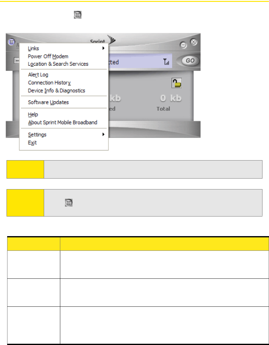 Sprint Connection Manager, displays the Sprint Connection Manager menu.