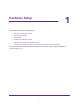 Contents Chapter 1 Hardware Setup Unpack Your Modem Router . . . . . . . . . . . . . . . . . . . . . . . . . . . . . . . . . . . . . . . . . . . 8 Top and Front Panel. . . . . . . . . . . . . . . . . . . . . . . . . . . . . . . . . . . . . . . . . . . . . . . . . . . 8 Rear Panel . . . . . . . . . . . . . . . . . . . . . . . . . . . . . . . . . . . . . . . . . . . . . . . . . . . . . . . . . . 10 Position Your Modem Router. . . . . . . . . . . . . . . . . . . . . . . . . . . . . . . . . . . . . . . . . .