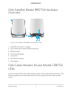 Orbi WiFi System Table 7. Cable modem router specifications (Continued) Feature Description Operating temperature 0° to 40°C (32º to 104ºF) Operating humidity 90% maximum relative humidity, noncondensing Electromagnetic emissions FCC Part 15 Class B VCCI Class B EN 55 022 (CISPR 22), Class B C-Tick N10947 LAN 10BASE-T or 100BASE-TX or 1000BASE-T, RJ-45 WAN 2 x 2 OFDM/OFDMA DOCSIS 3.1 32 x 8 SCQAM DOCSIS 3.0 WiFi Maximum wireless signal rate complies with the IEEE 802.11 standard.
