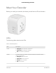 1 Overview The WiFi Range Extender boosts your existing network range and speed, delivering dual-band WiFi. This chapter covers the following topics: • • • Meet Your Extender When to Use Your Extender How the Extender Works Note: For more information about the topics covered in this manual, visit the support website at support.netgear.com.