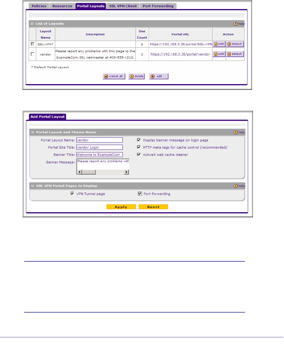 1. Select VPN > SSL VPN from the menu, and then select the Portal Layouts tab.