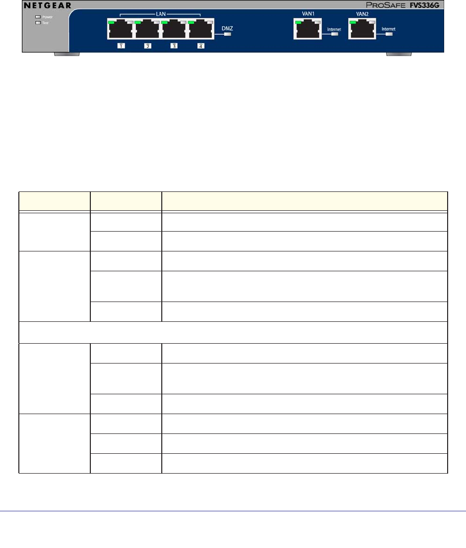 indicator LEDs, including Power and Test, LAN, WAN1, and WAN2: