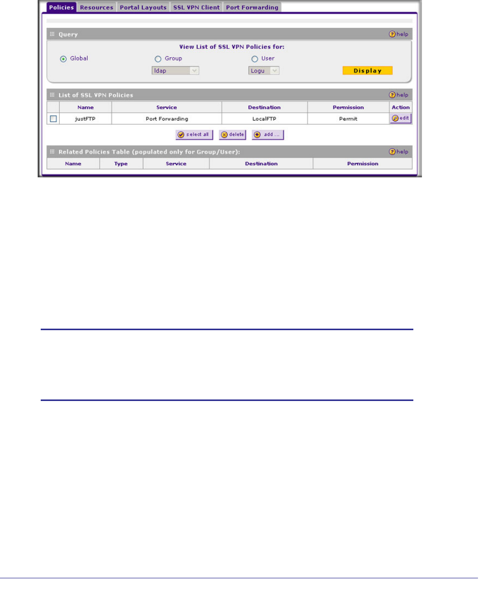 Note: Global policies are displayed in the List of SSL VPN Policies table.