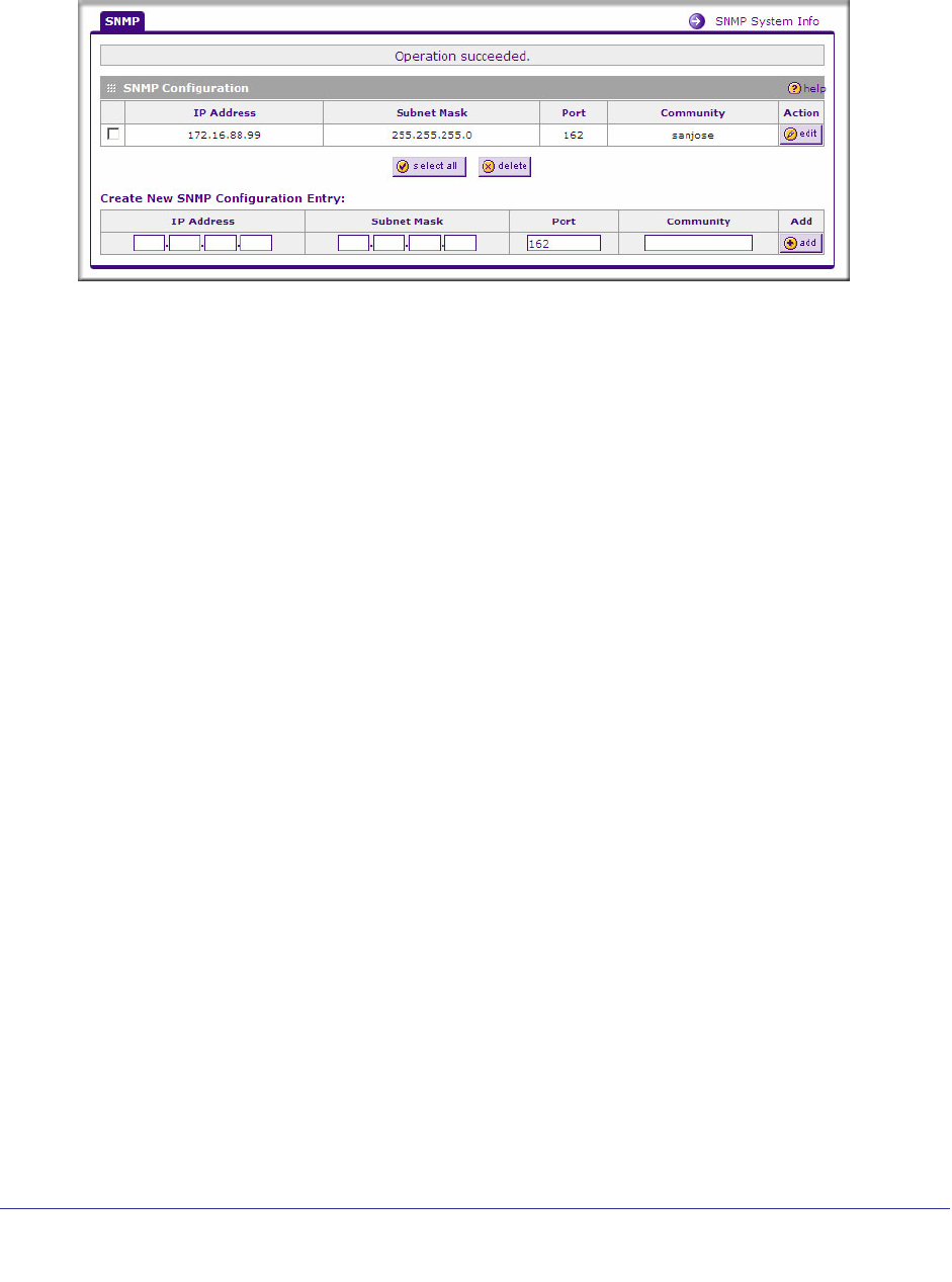 To modify an SNMP configuration, click Edit in the Action column adjacent to the entry that