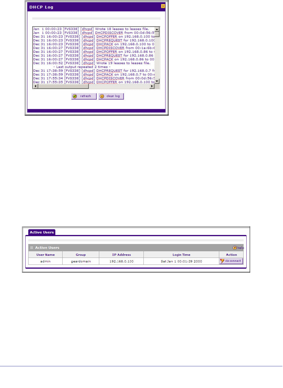 2. Click the DHCP Log link to the right of the tabs. The DHCP Log appears in a popup