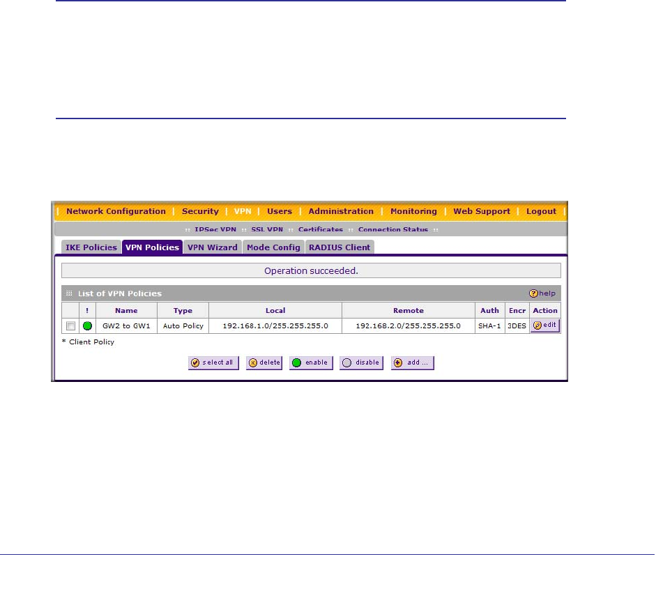9. Click Apply to save your settings. The VPN Policies screen shows that the policy is
