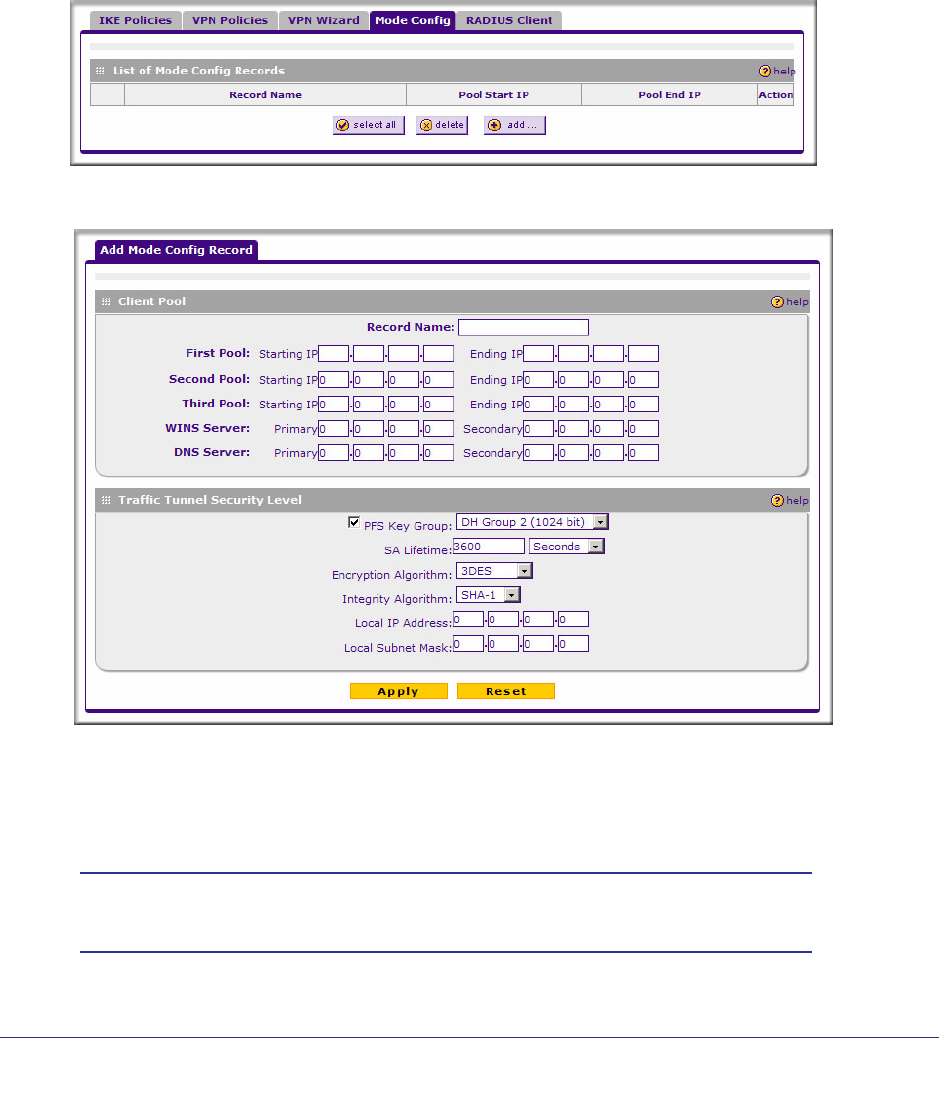 You need to configure two screens to configure Mode Config operation on the VPN firewall: