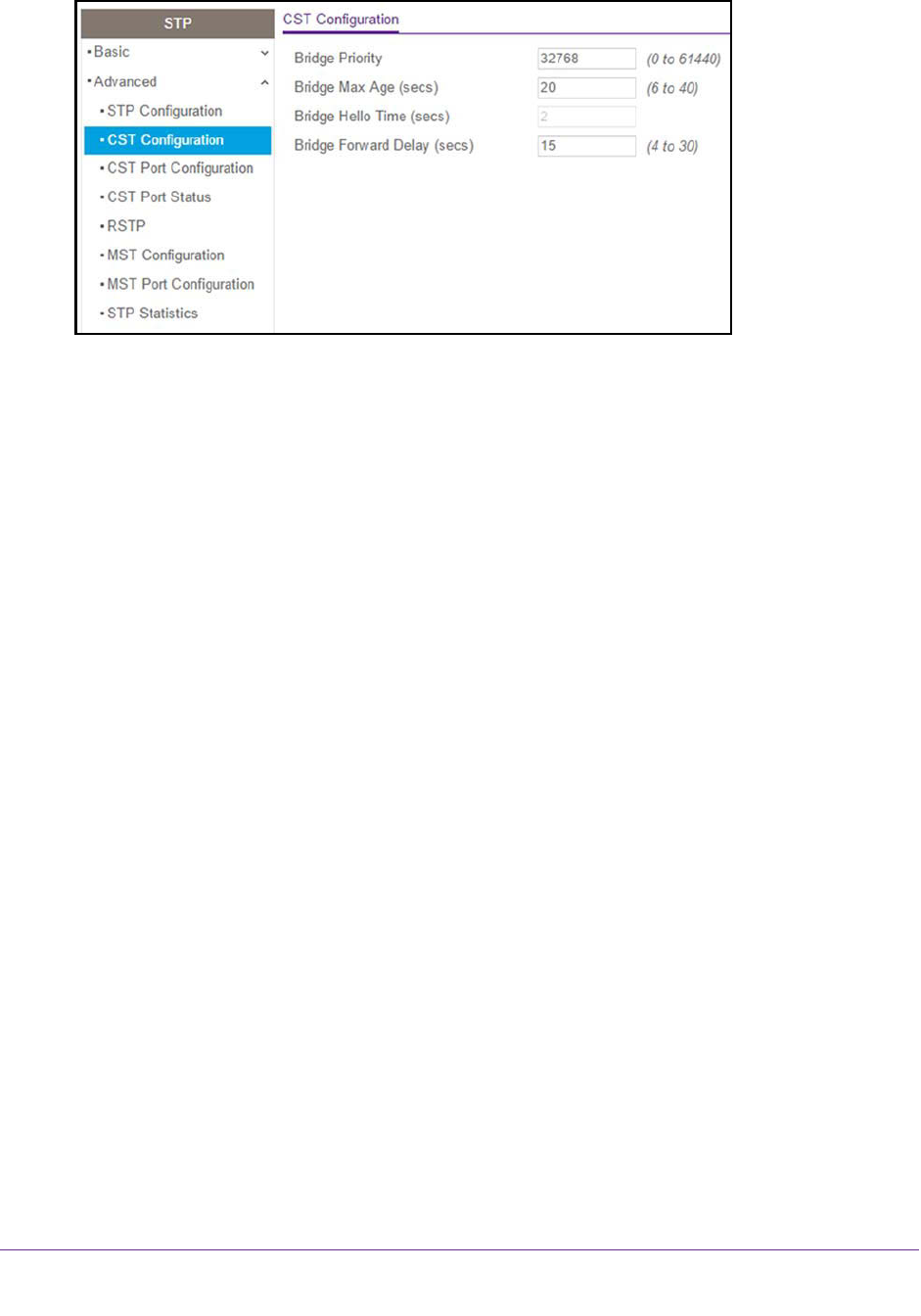Spanning Tree (CST), which indicates the time in seconds a root bridge must wait