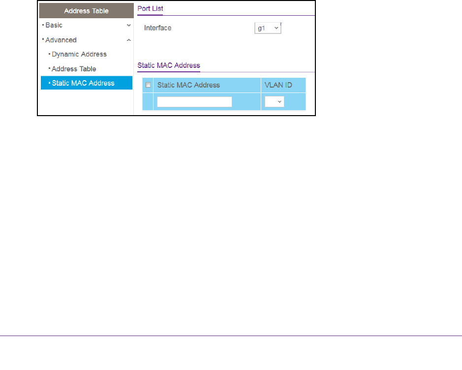 5. Select Switching > Address Table > Advanced > Static MAC Address.