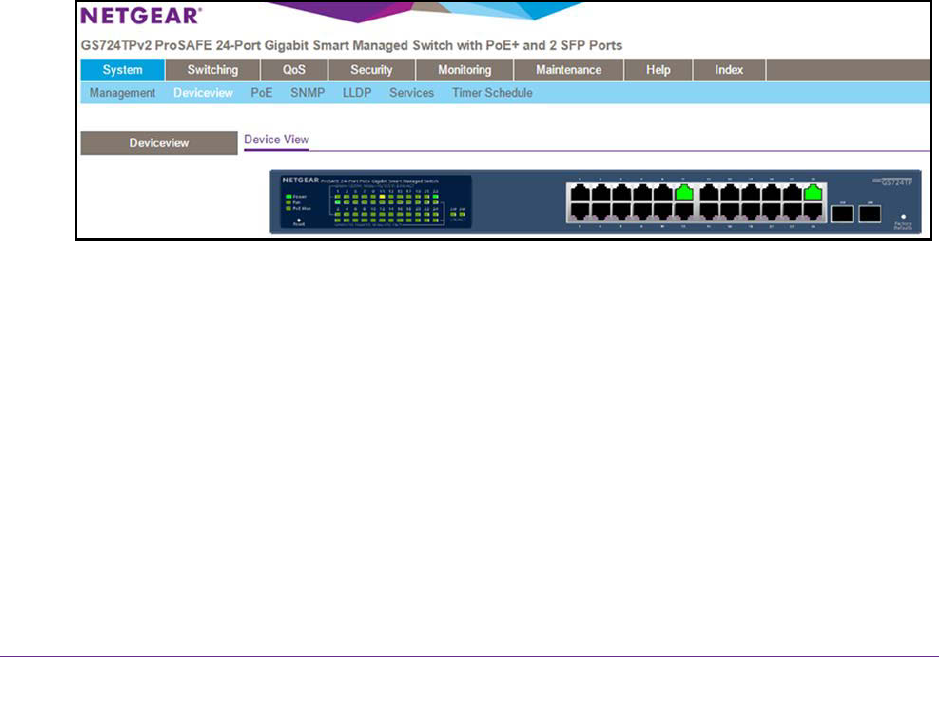 The Device View displays the ports on the switch. This graphic tool provides an alternate way