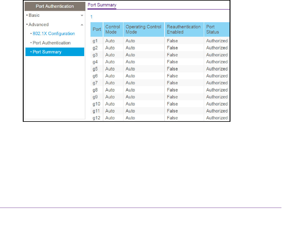 5. Select Security > Port Authentication > Advanced > Port Summary.