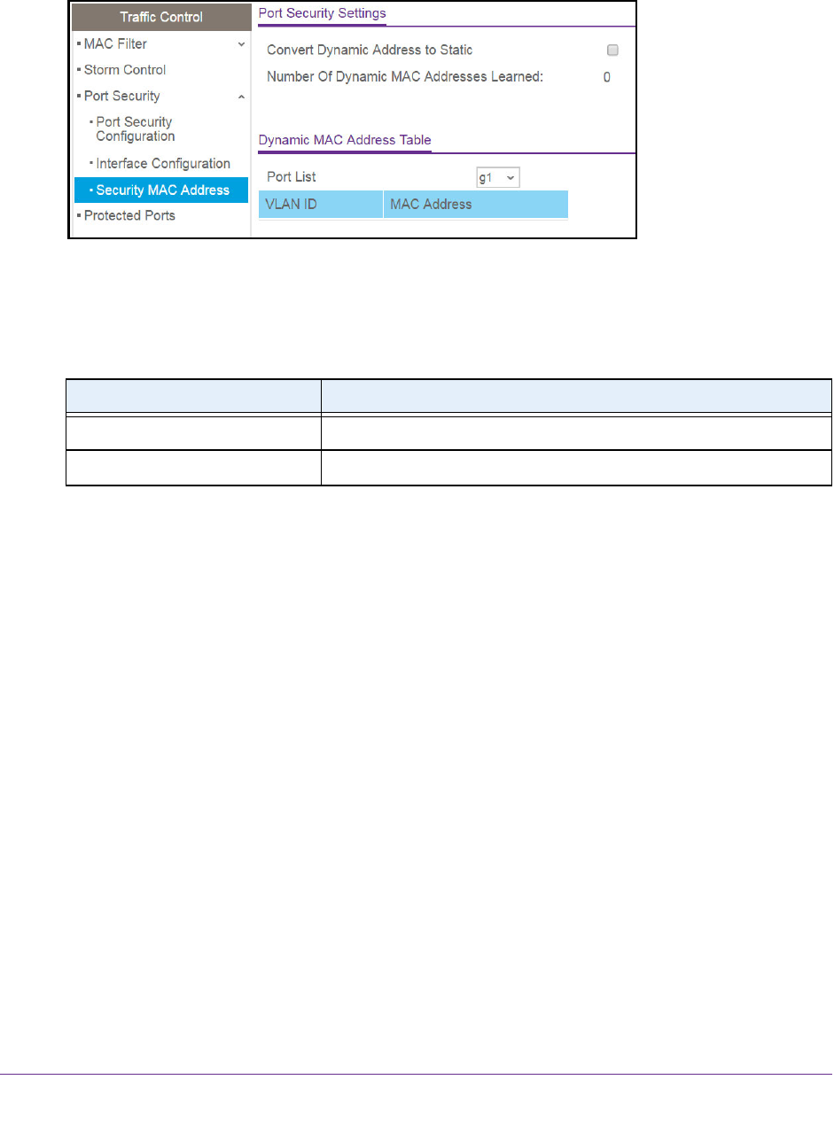 9. Select Security > Traffic Control > Port Security > Security MAC Address.