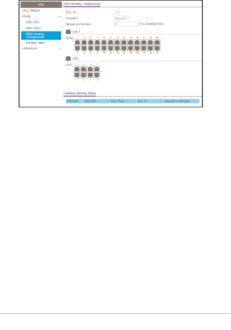 8. To add the selected ACL to a port or LAG, in the Ports table or LAG table, click the port or
