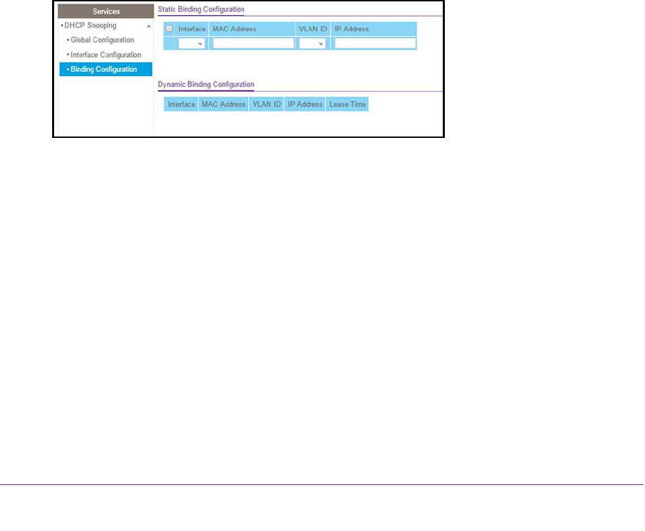 5. Select System > Services > DHCP Snooping > Binding Configuration.