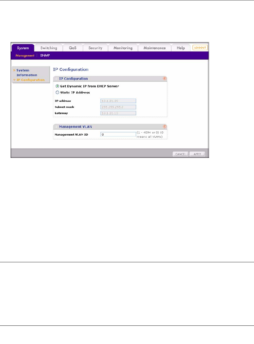 1. Select the System > Management > IP Configuration screen shown below to set your IP