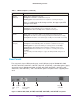 NETGEAR Managed Switch Table 1. LED descriptions LED Description Power Solid green: Internal power supply operating normally and supplying power to the switch. Solid yellow: The system is in boot-up stage. Blinking yellow: Power module is present but has failed. Off: Power is disconnected. Fan Solid green: The fan is operating normally. Solid yellow: The fan has failed. Off: No fan is detected. RPS Solid green: RPS connected (using internal power supply’s power).