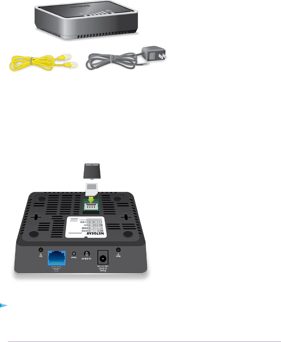 Your package contains the modem, an Ethernet cable, and a power adapter.