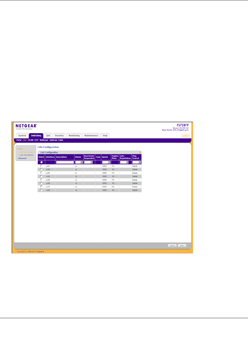 1. Click Switching > LAG > Basic > LAG Configuration. The Basic LAG Configuration