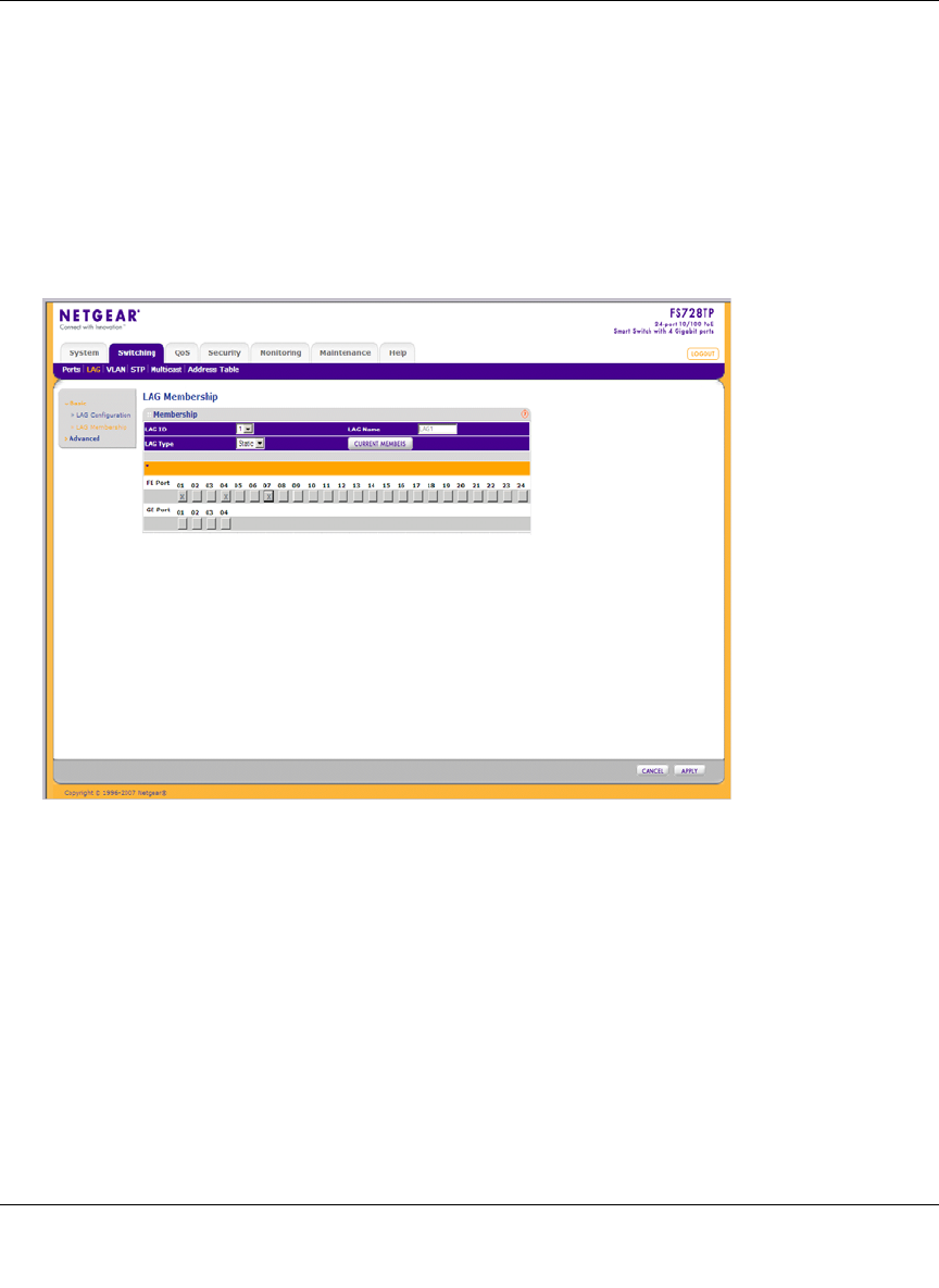 1. Click Switching > LAG > Basic > LAG Membership. The Basic LAG Membership screen