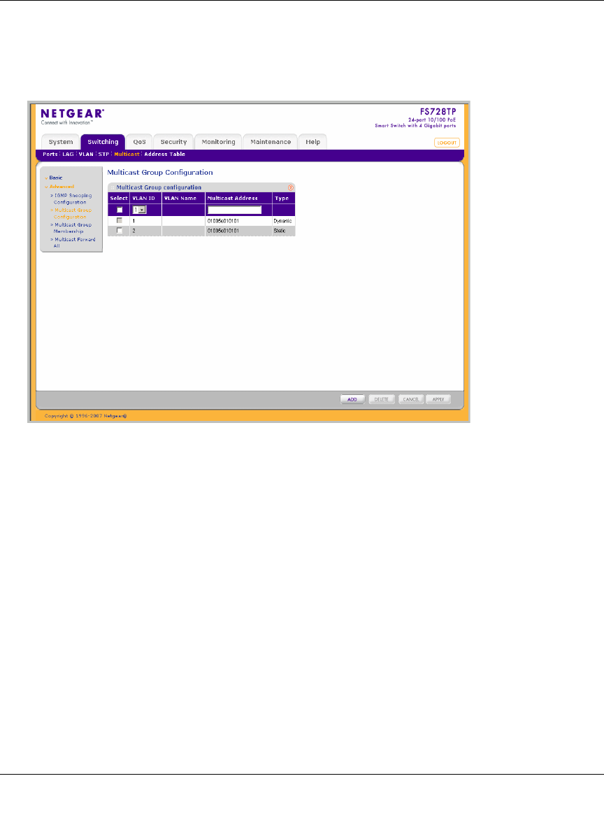 1. Click Switching > Multicast > Advanced > Multicast Group Configuration.
