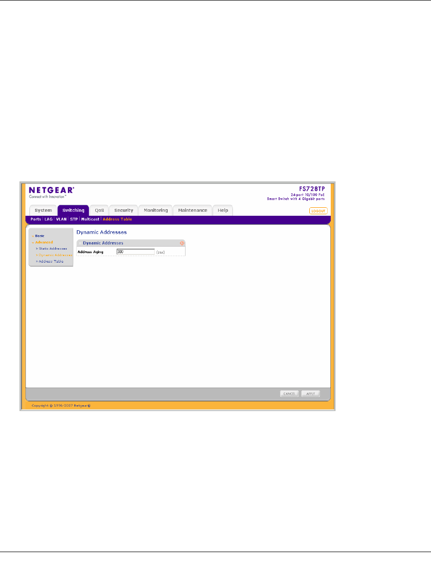 The Dynamic Addresses screen contains information about the aging time before a dynamic MAC