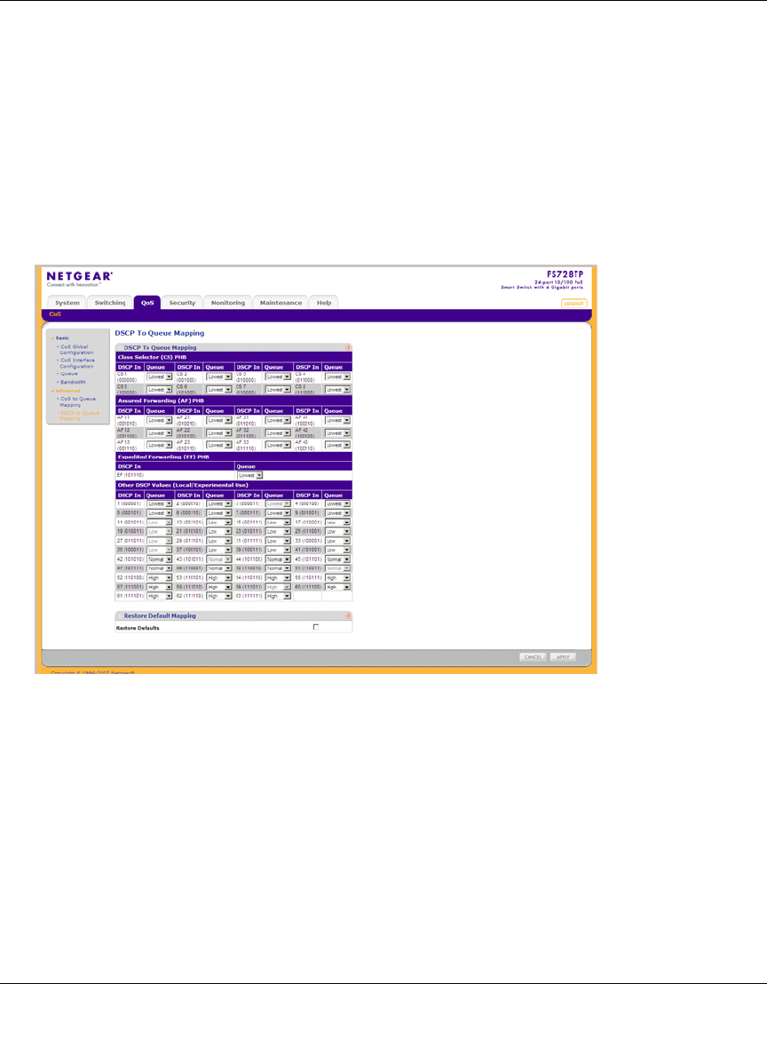 1. Click QoS > CoS> Advanced > DSCP To Queue Mapping. The DSCP To Queue Mapping