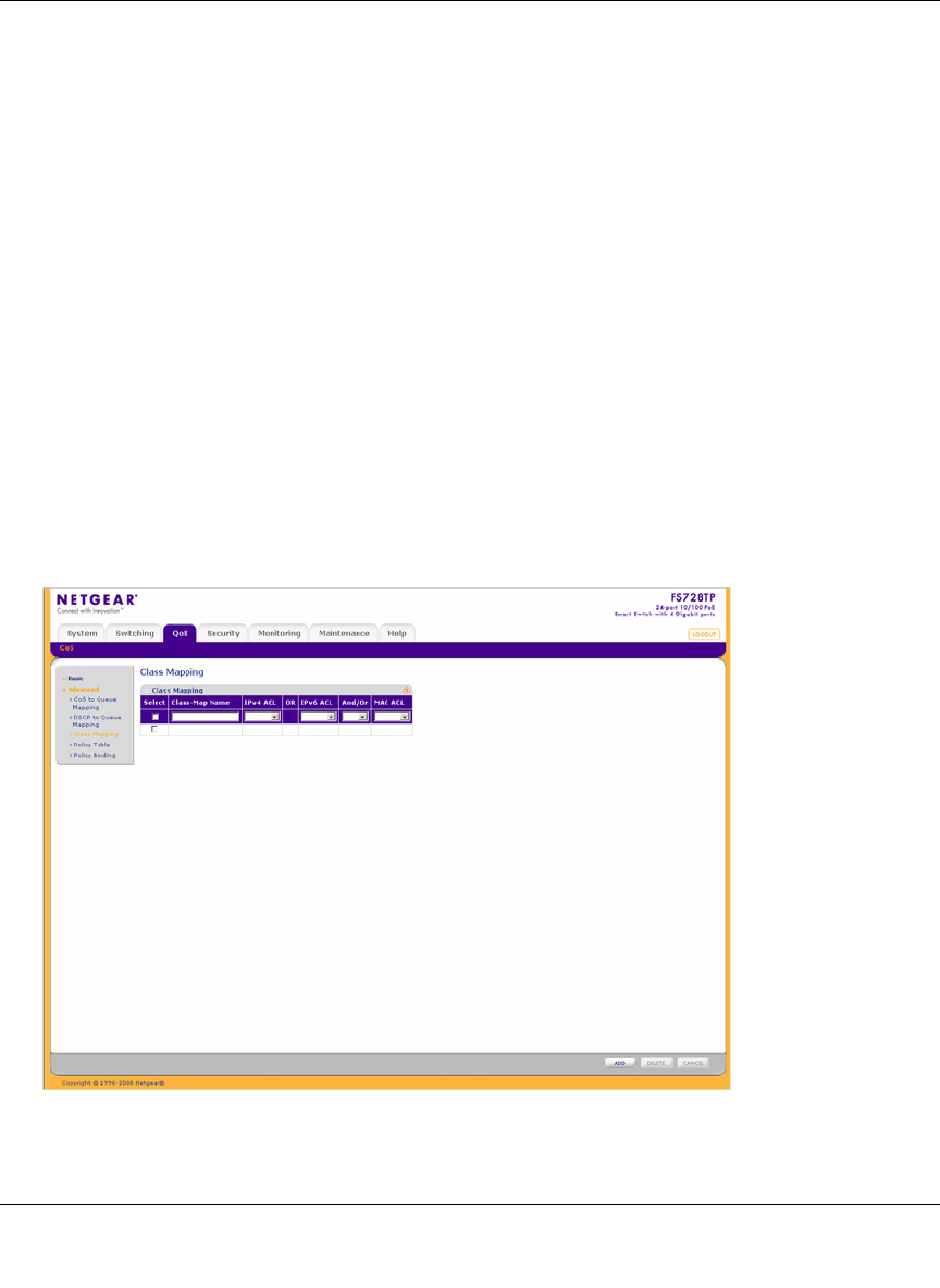 1. Click QoS > CoS > Advanced > Class Mapping. The Class Mapping screen displays:
