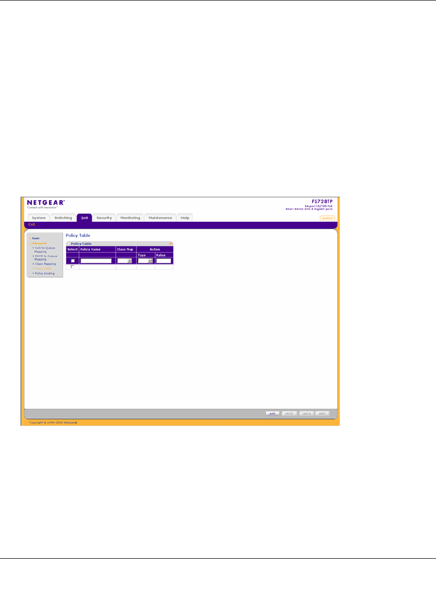 1. Click QoS > CoS> Advanced > Policy Table. The Policy Table screen displays: