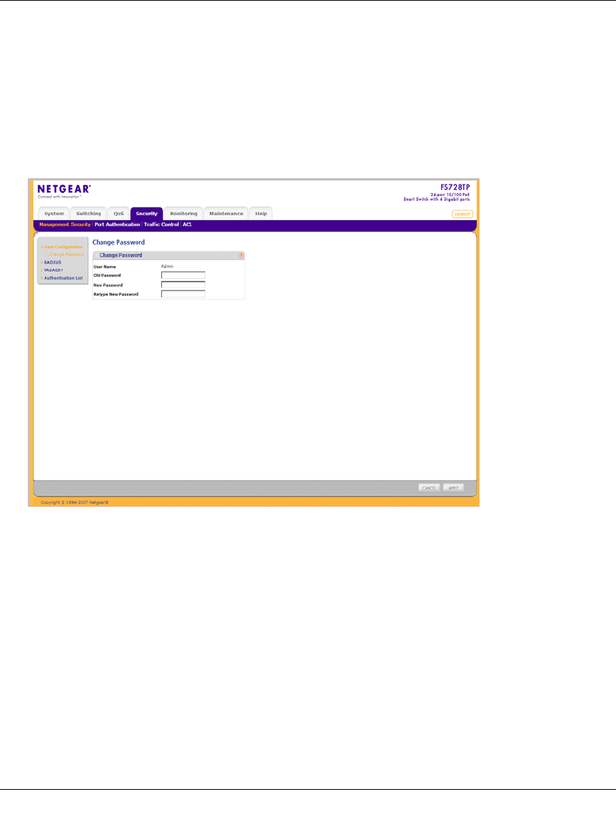 1. Click Security > Management Security > User Configuration > Change Password. The