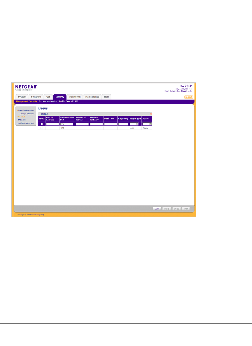 1. Click Security > Management Security > RADIUS. The RADIUS screen displays: